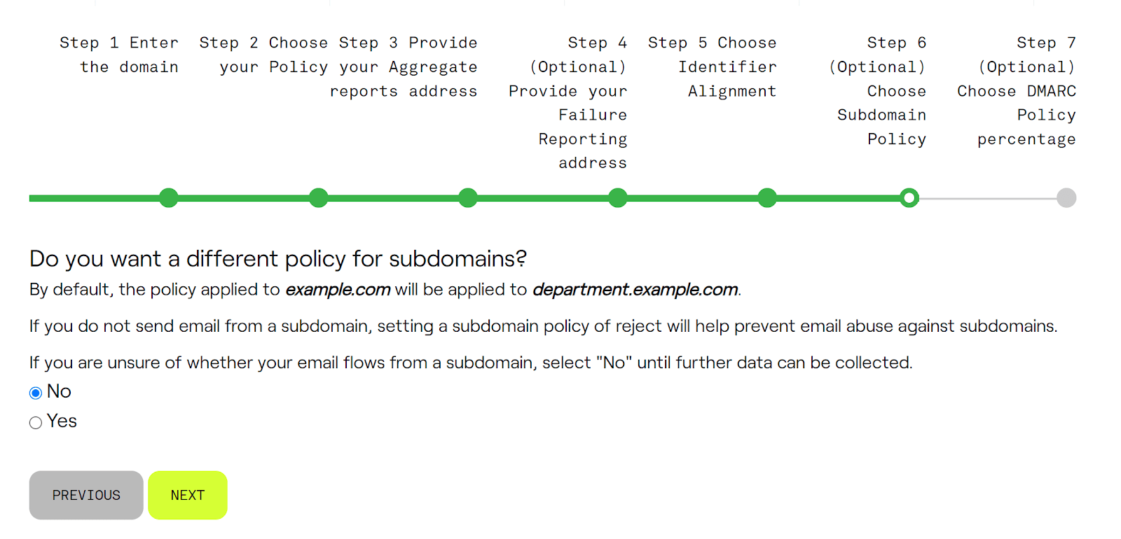 This optional step lets you set a different DMARC policy specifically for subdomains of your main domain. By default, the same policy set for the main domain applies to all its subdomains. Setting a “reject” policy for subdomains can add security if you don’t send emails from them, helping prevent abuse. If you’re unsure about email flows from subdomains, it’s advisable to choose “No” and use aggregate data to make an informed decision later.
