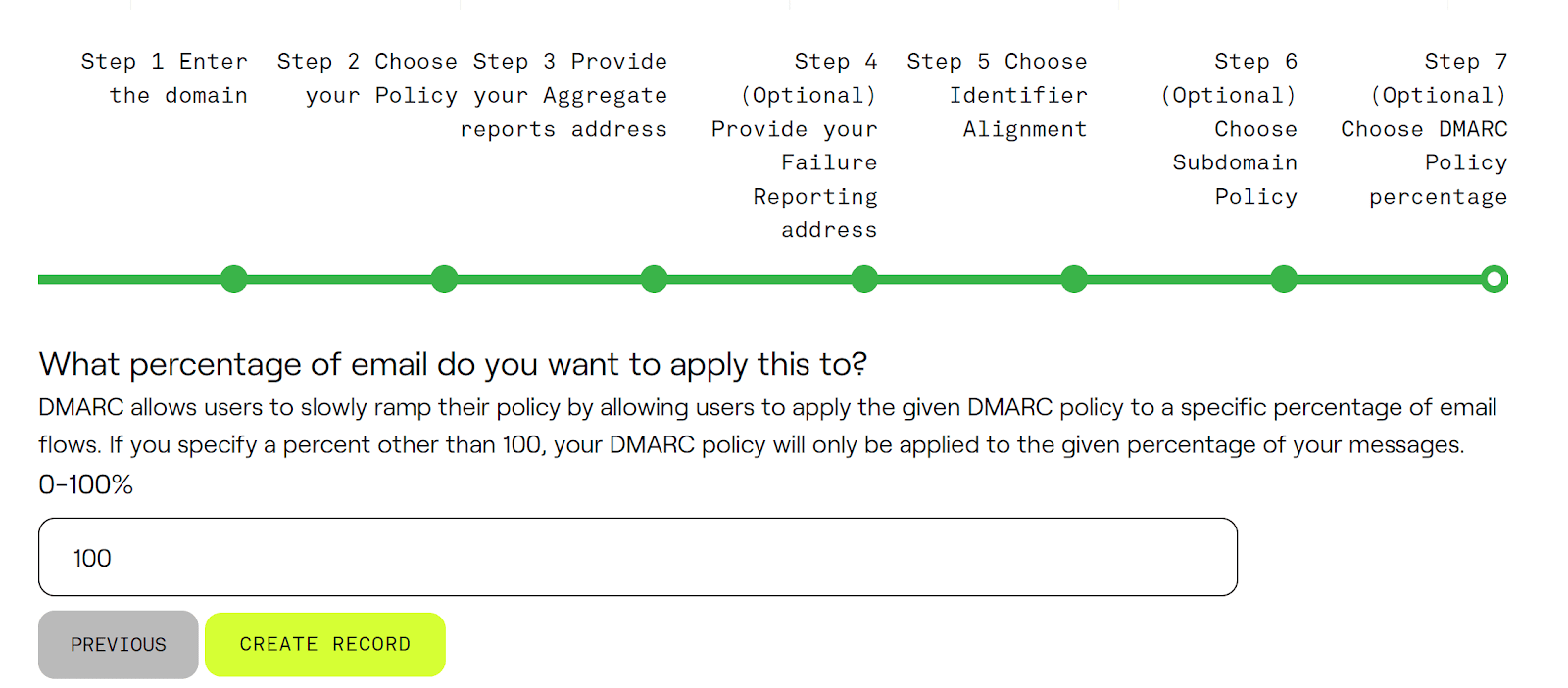 This step allows you to specify the portion of your email traffic that the DMARC policy will affect. It’s designed to facilitate a gradual rollout. By not setting this to 100% immediately, you can minimize disruptions to your legitimate email while monitoring the effects and reports. It gives you the flexibility to enforce the policy on a fraction of your emails and scale up as you become more confident in the DMARC setup. Then, the record can be created.