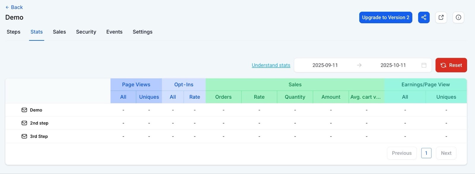 Section titled “Steps: Here is where you will see all the steps you have in your funnel/website.”Stats: This section provides customers with an overview of the funnel or website performance.