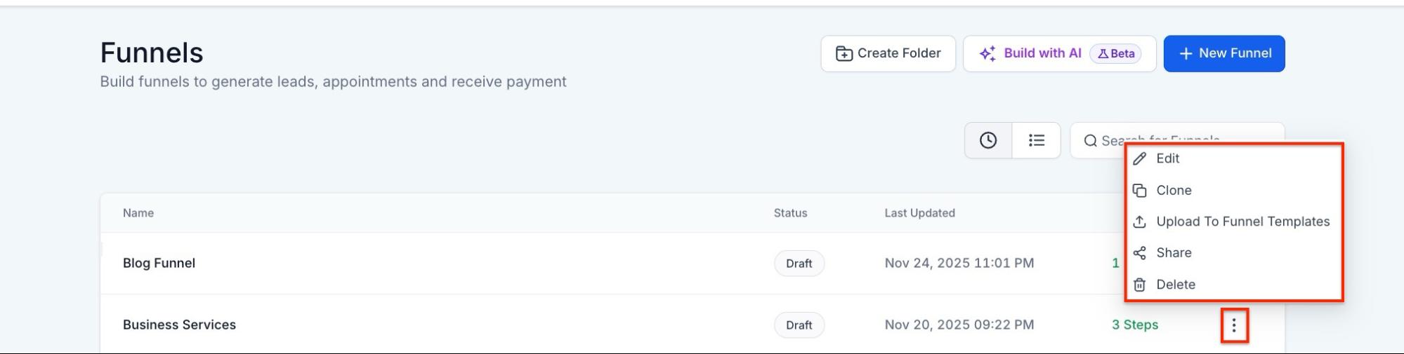 - You can also clone the funnel/website, move it to a folder, or delete it. You will see these options when you click the 3 dots next to the funnel.