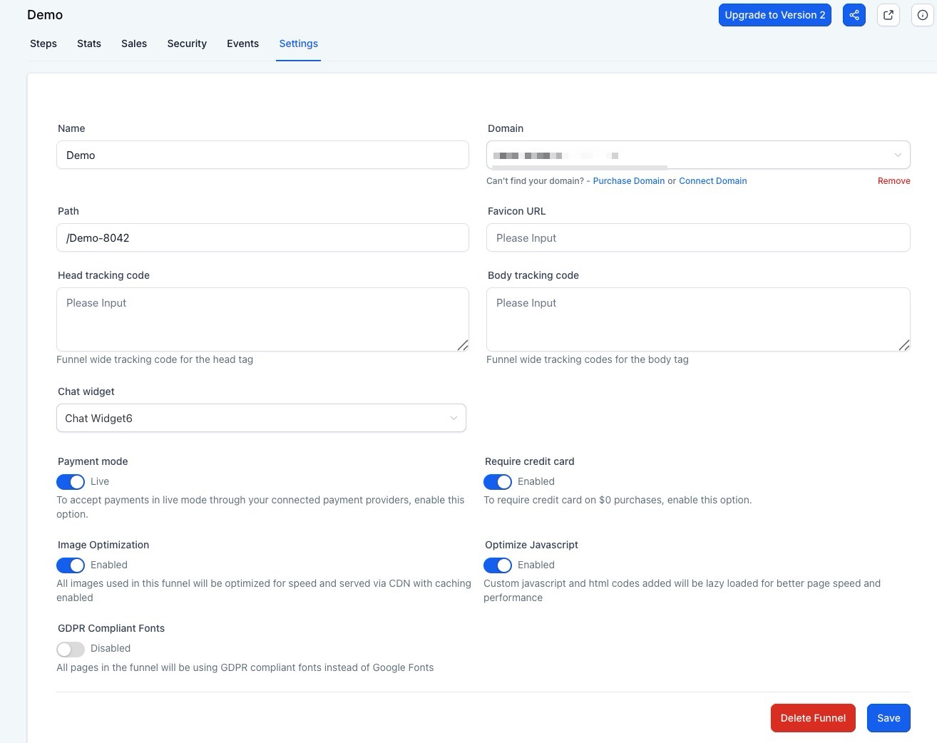 Settings: You can edit the funnel or website name, select your domain, path, and favicon URL, add a head tracking code and body tracking code, toggle your payment to test or live mode, enable or disable the chat widget, and turn on or off the image optimization and the Javascript element optimization. You can also enable or disable the GDPR-Compliant Fonts if you don’t want to use Google Fonts.