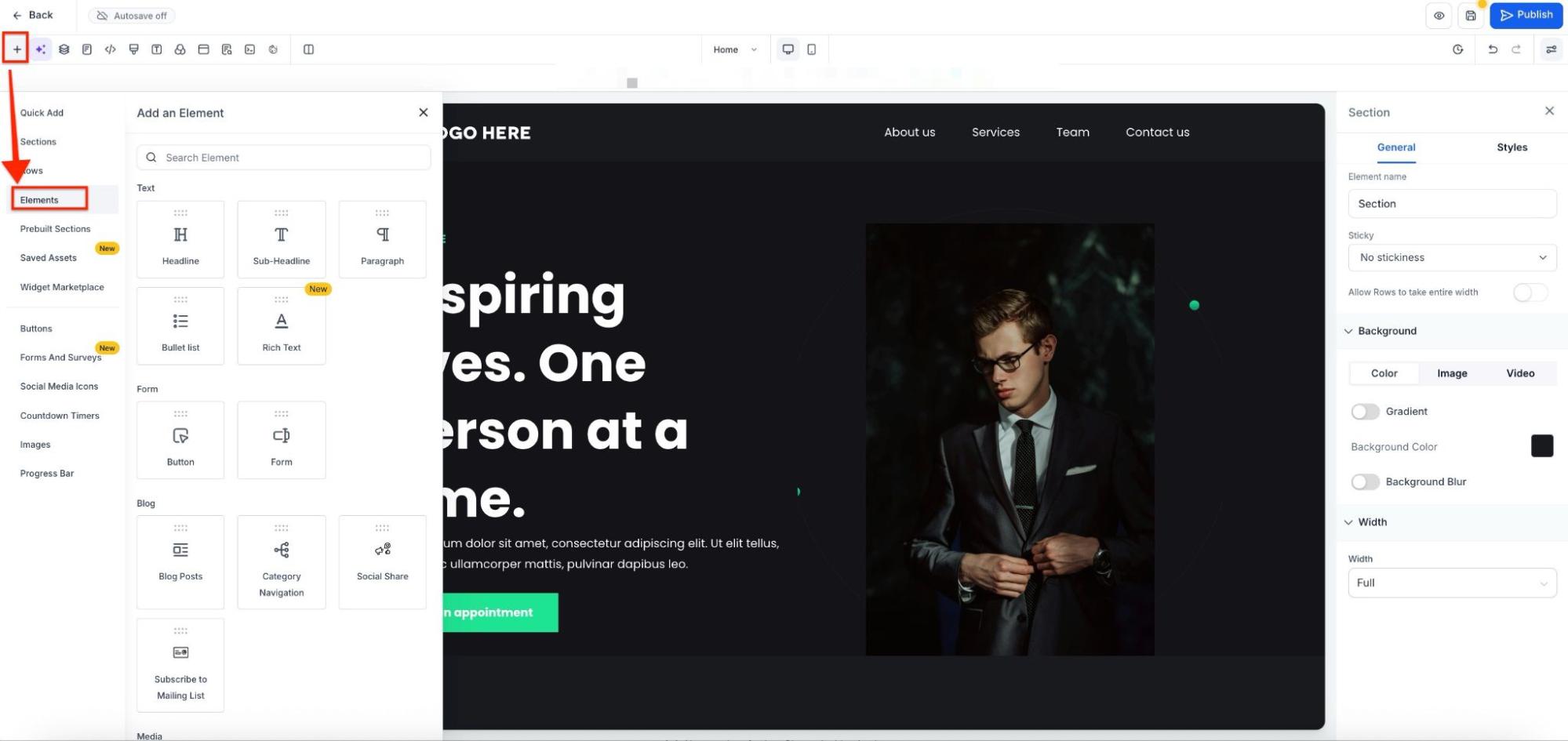 Section titled “Elements”This feature allows you to add elements to the funnel. You can easily drag and drop the elements into the funnel, customizing it to suit your needs. Additionally, you can manage sections, rows, global sections, and section templates in the elements section.