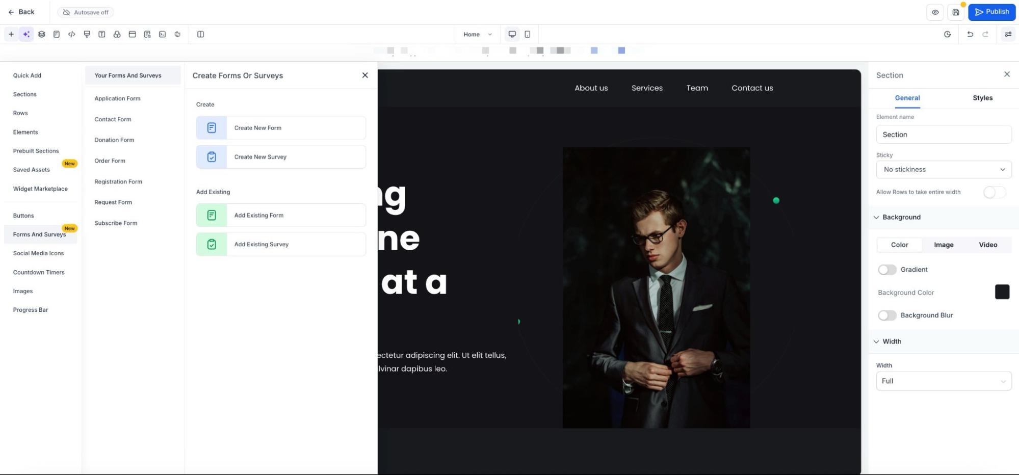 - A dedicated Forms & Surveys section allows users to create, manage, and embed forms or surveys without switching tools.