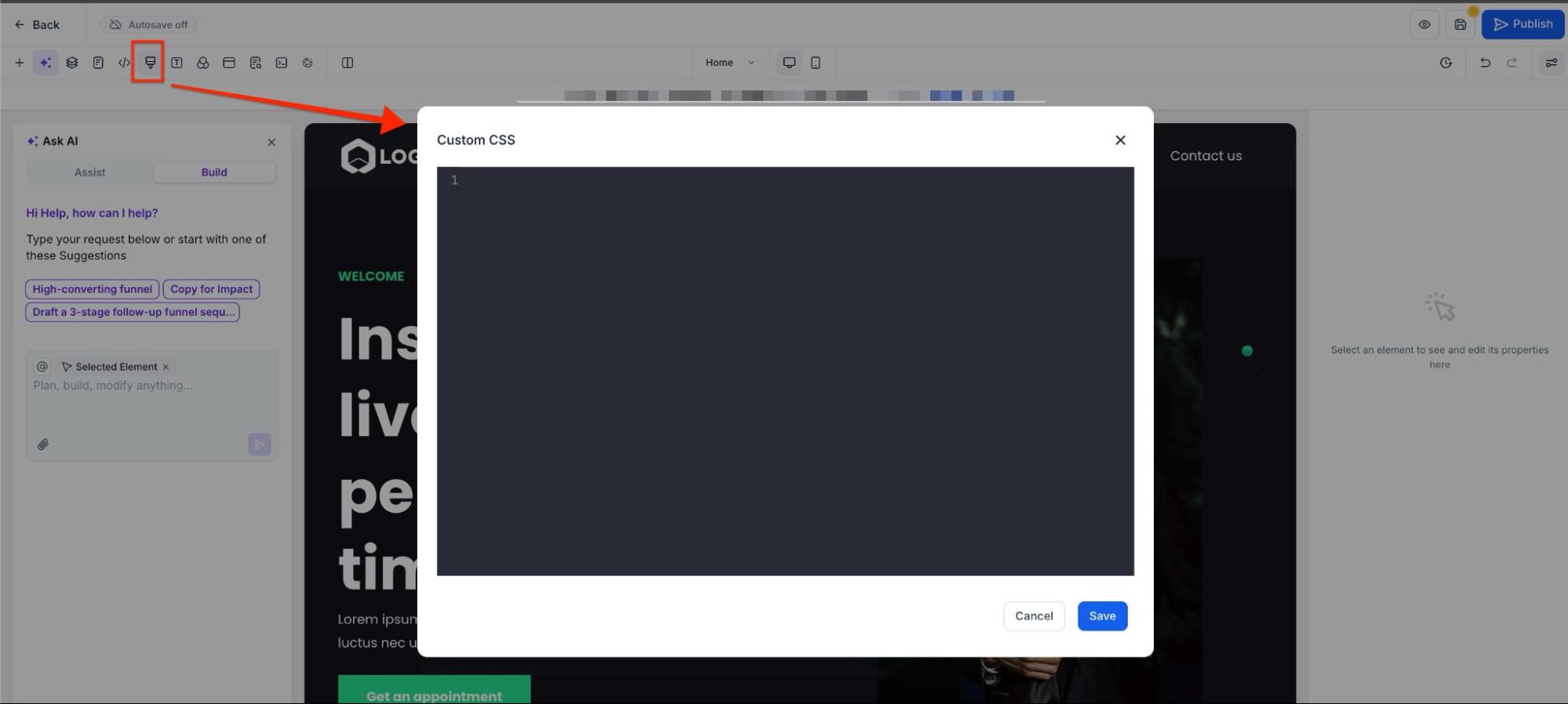 Section titled “Custom CSS”You can add custom CSS code to make changes to the customization of the elements that are not included in the standard features.