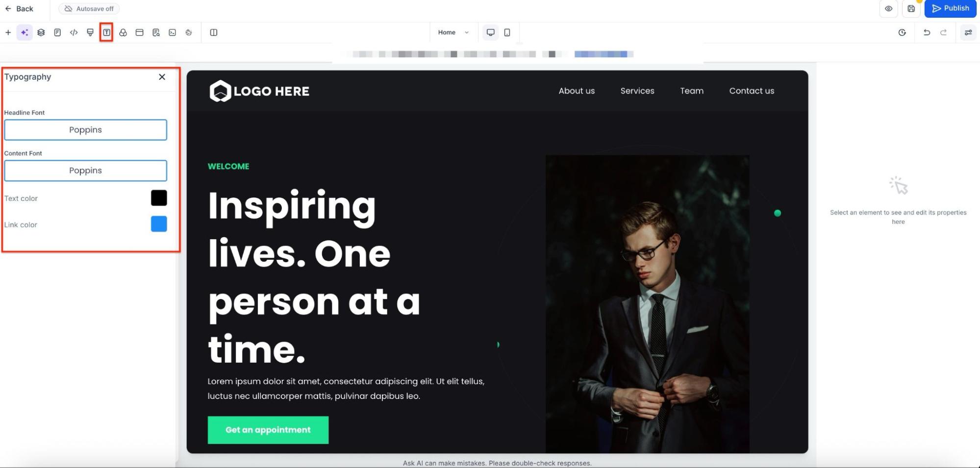 Section titled “Typography”This feature allows you to change the font type of the headline, content, text color, and link color across all pages. You can still edit the font typography, size, and color of specific text elements in their settings.