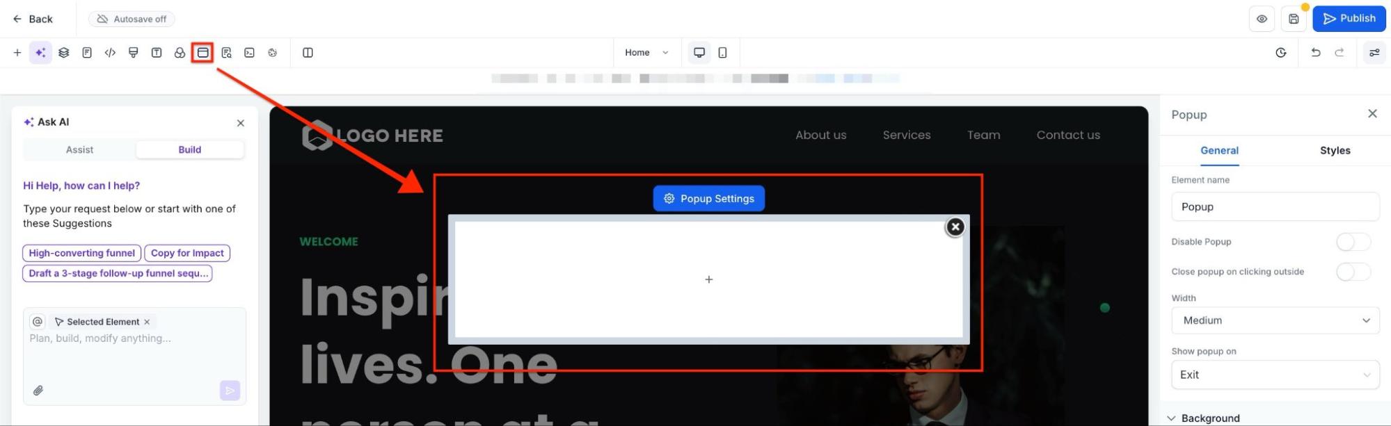 Section titled “Pop Up”This is a small window that will appear when your leads try to exit the page, click on a button (depending on your settings), or after a specified time. You can add rows and elements, such as a form, to help you collect leads.