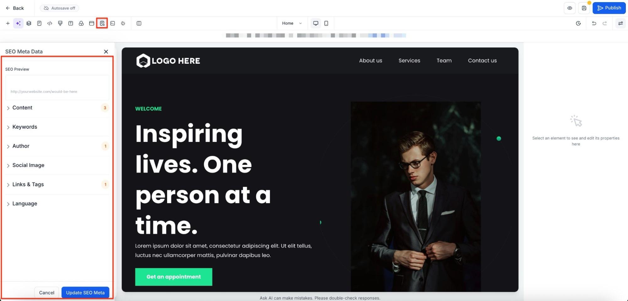 Section titled “SEO Meta Data”This tool allows you to edit the tab title and improve your Google search results by adding keywords that will appear in search results.