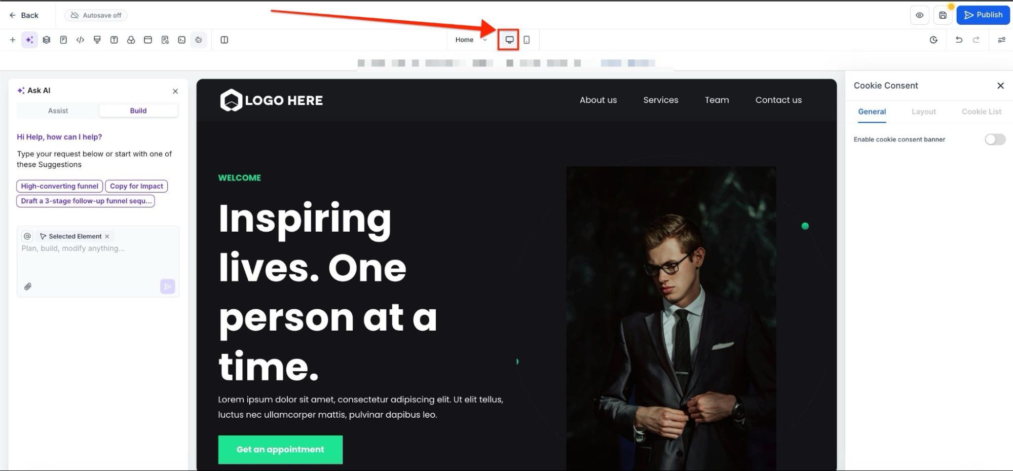Section titled “Desktop Icon”This feature allows you to see your page as if you are visiting it from a desktop. You can make changes to the elements according to the desktop view.
