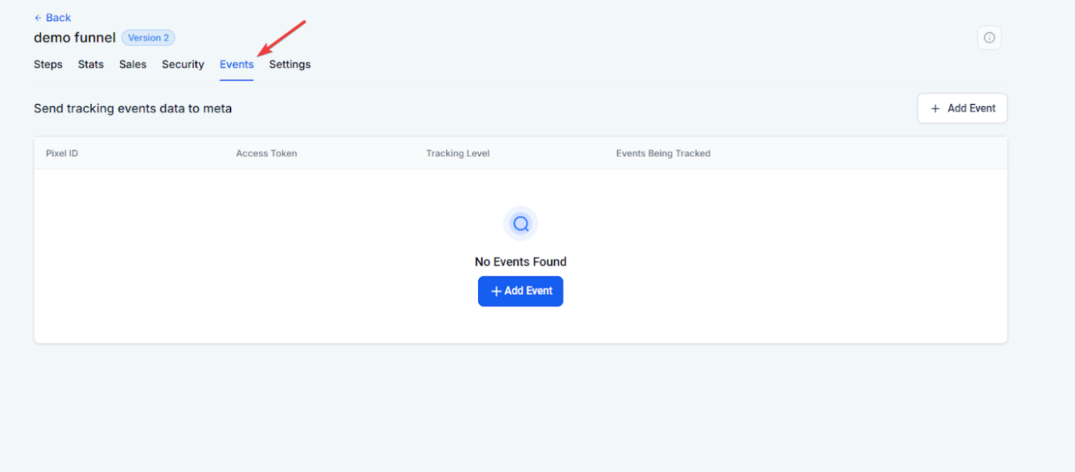 - Open the funnel/website you want to send track events on. Go to the Events tab in the funnel/website overview screen.