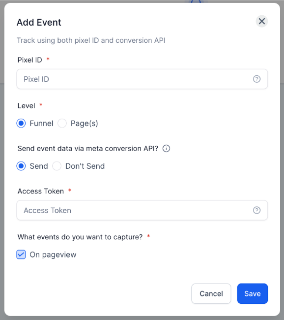 - Conversion API Support: Choose to send event data via Facebook Conversion API by entering an access token.
