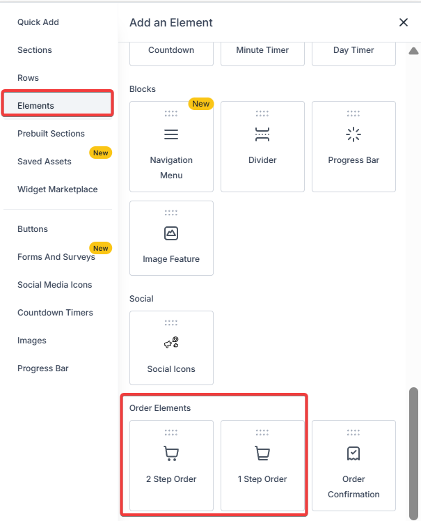 - In the builder, after adding the section and row you’ll need to add an element. The element needs to be an order form.