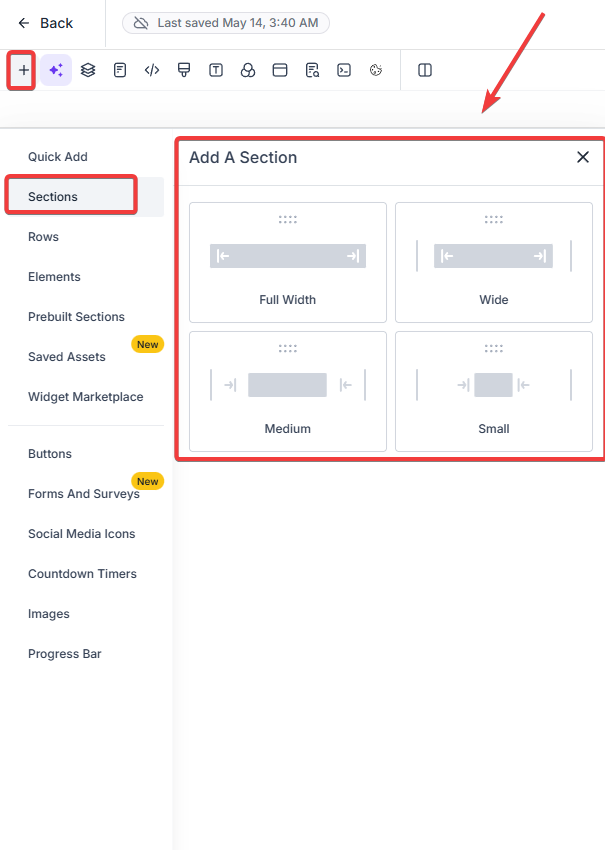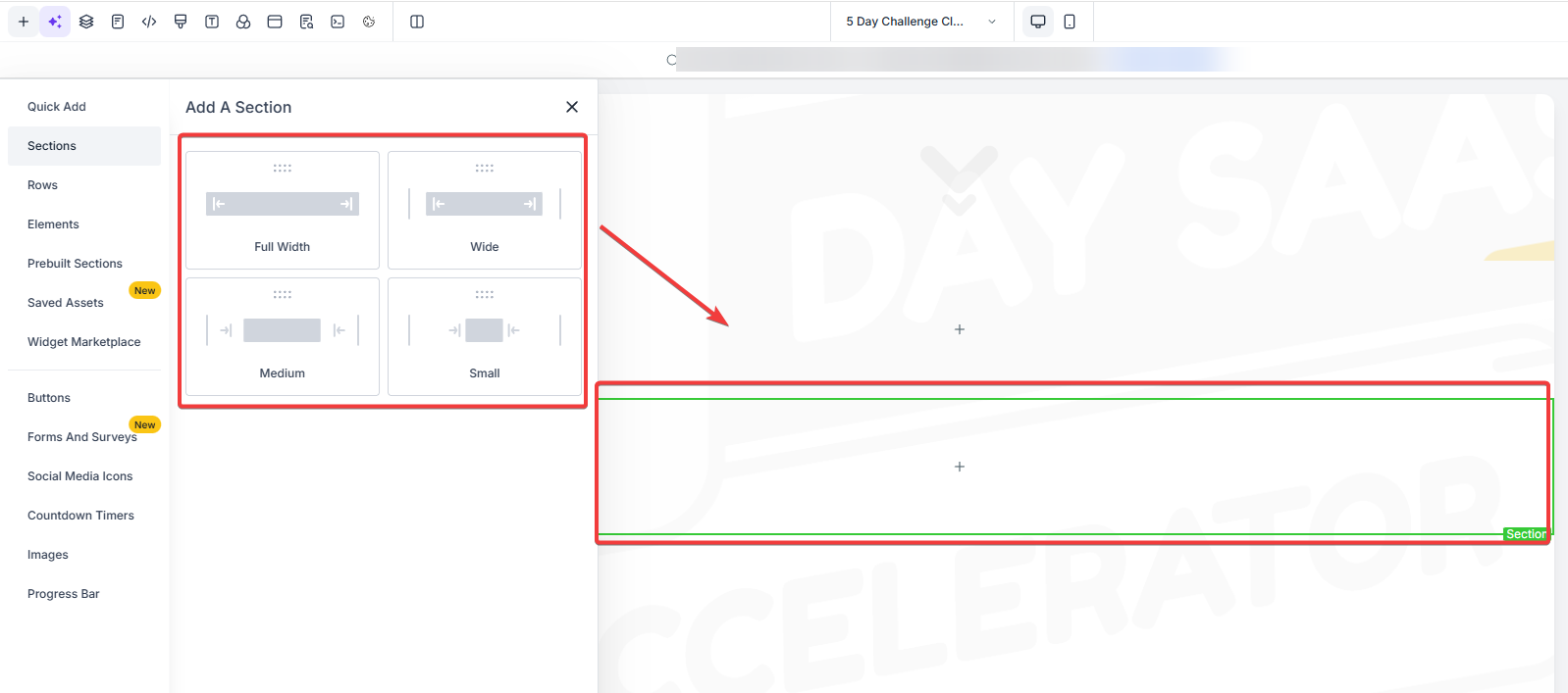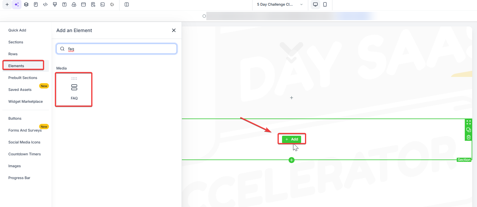 2- Add a New Section Click on the + Add Section button to create a new section in your funnel or website. This is where you’ll place your FAQ. Drag and drop the desired section to the suitable location.