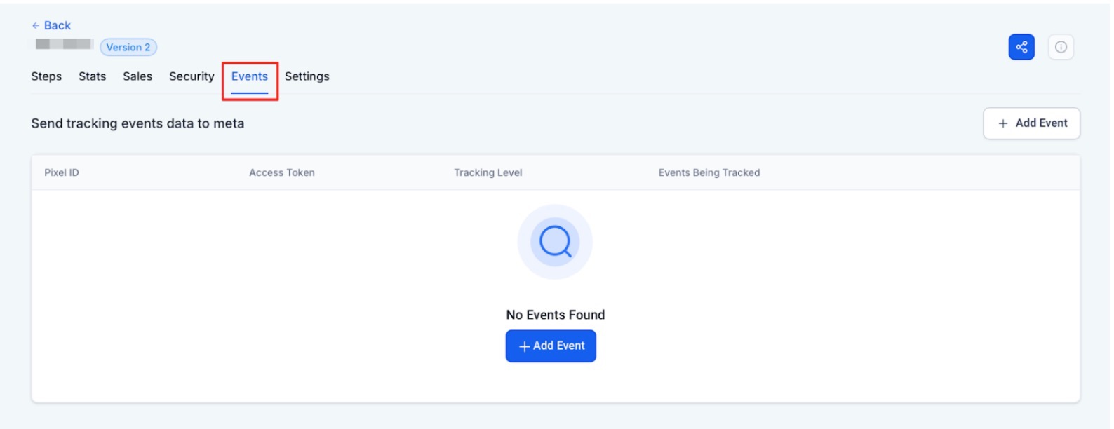 - In the funnel or page overview, go to the “Events” tab, click “Add event,” and enter your Pixel ID.