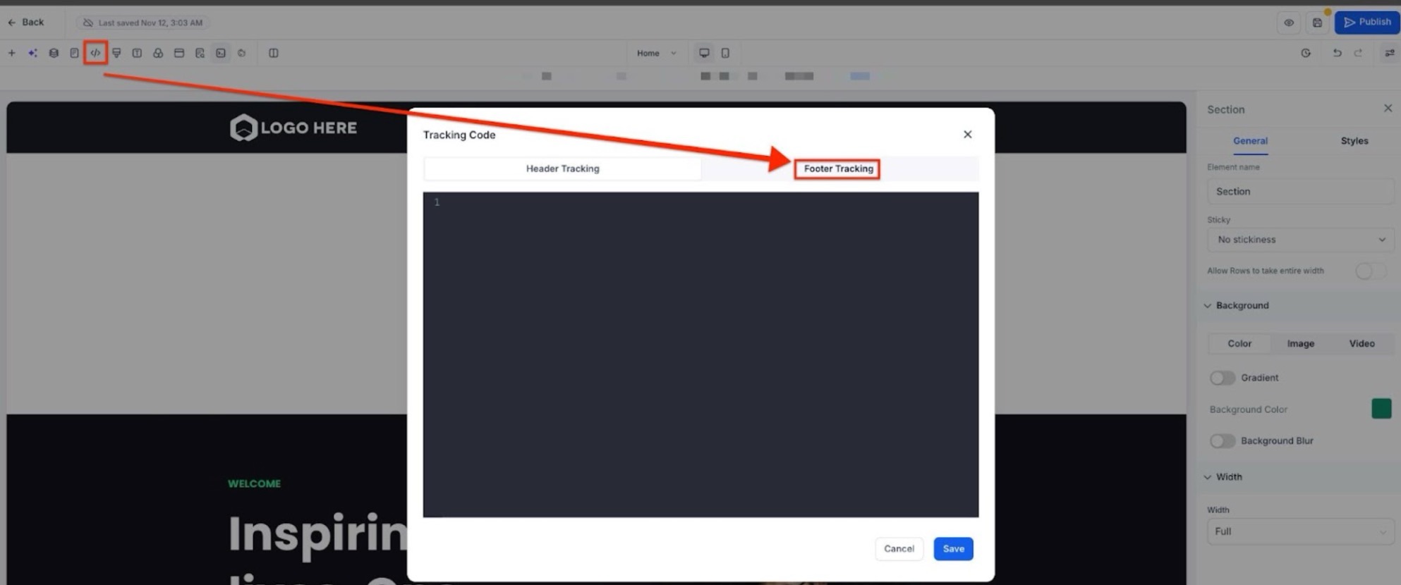 - For individual page tracking, add the event-specific code in the tracking code section of that page (usually in the footer).