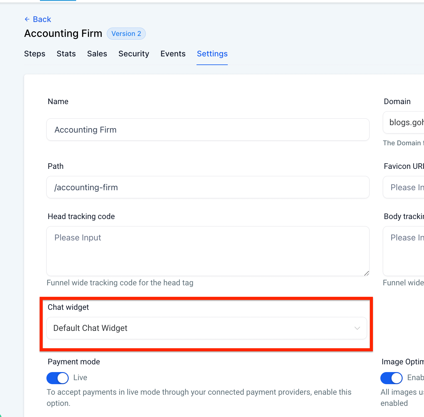 - In your funnel or website settings, select the chat widget you want to use for specific pages.