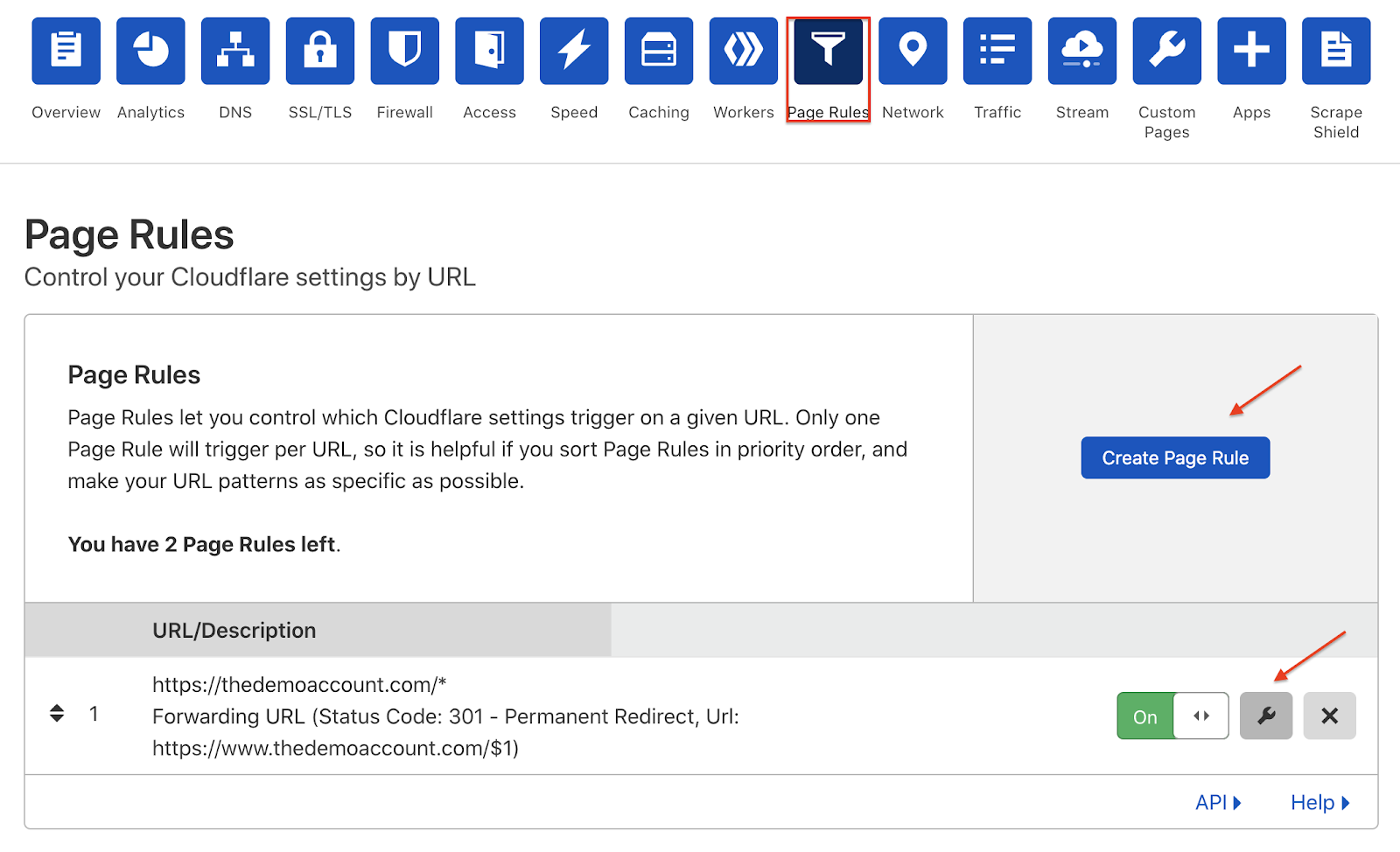 - Create Page Rule or click the tool icon to edit an existing rule.