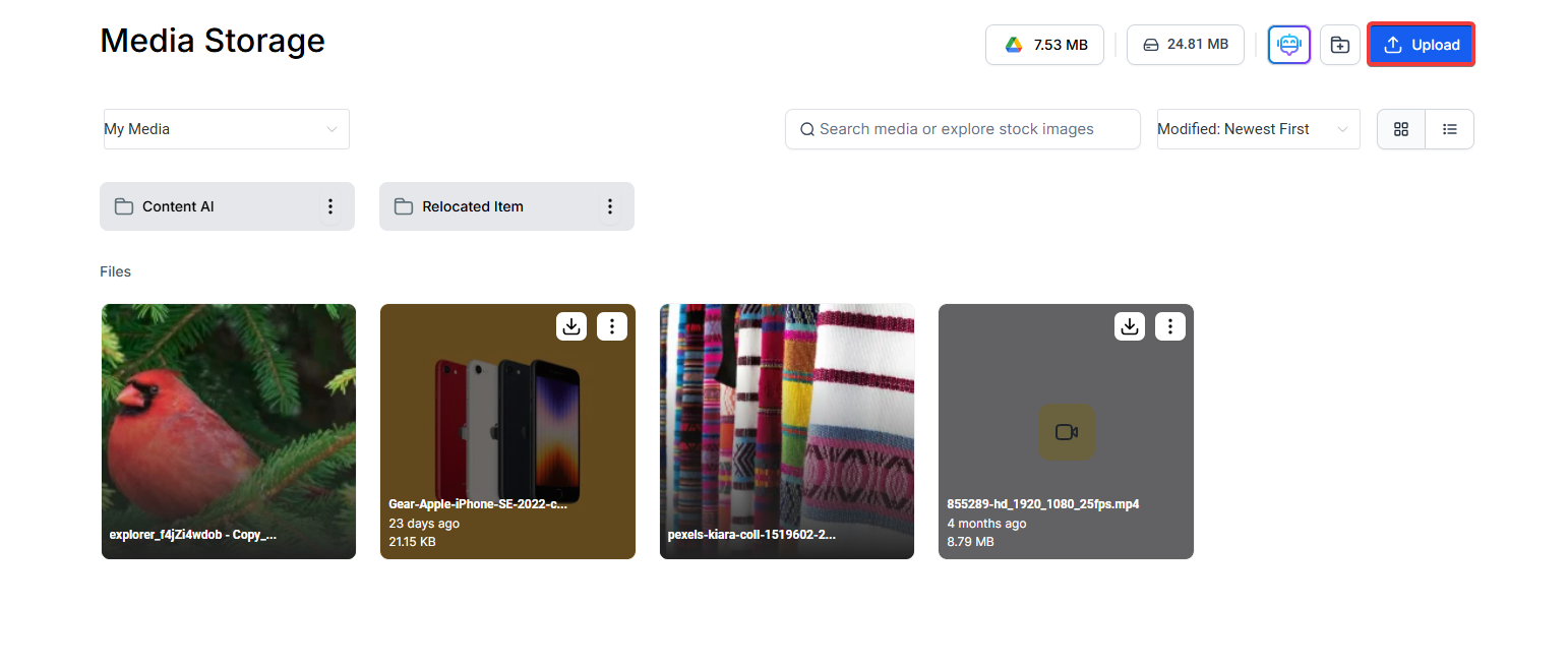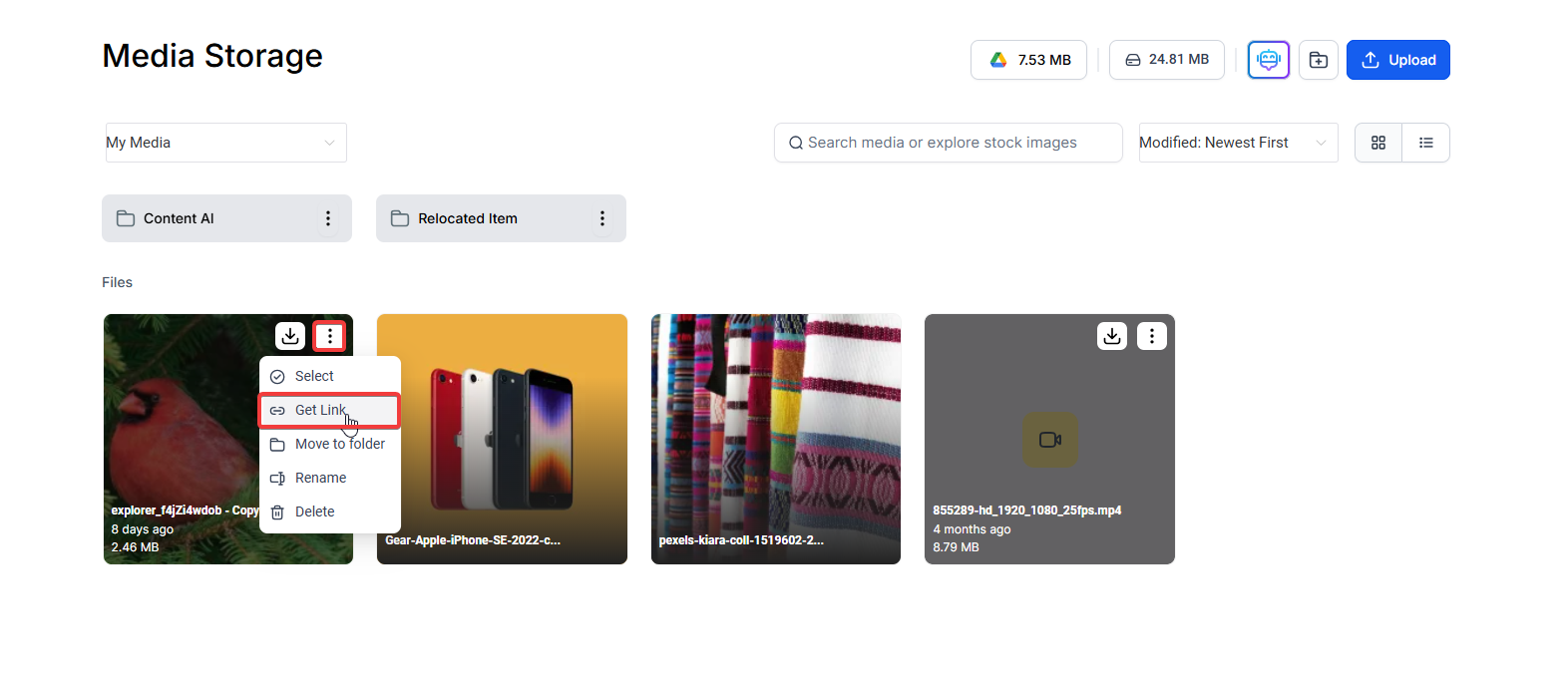 - Copy the image URL to your clipboard by clicking the “Get link” button in your media tab.