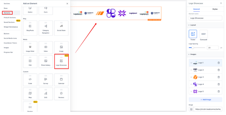 - Drag the Logo Showcase element onto your funnel or website page using the builder interface.