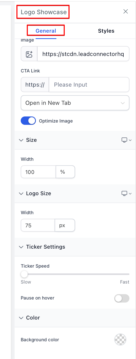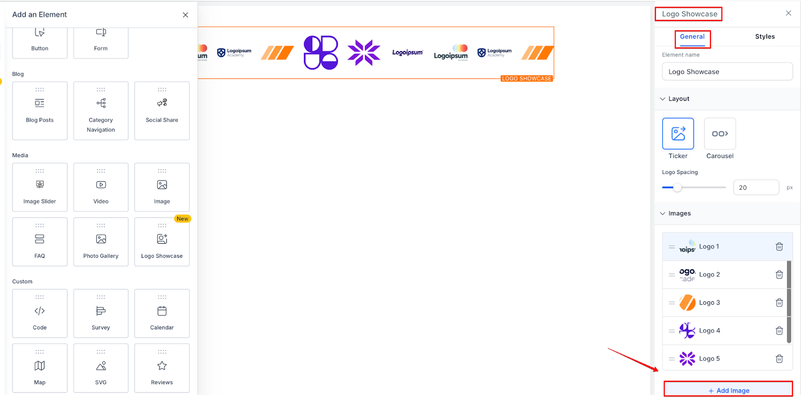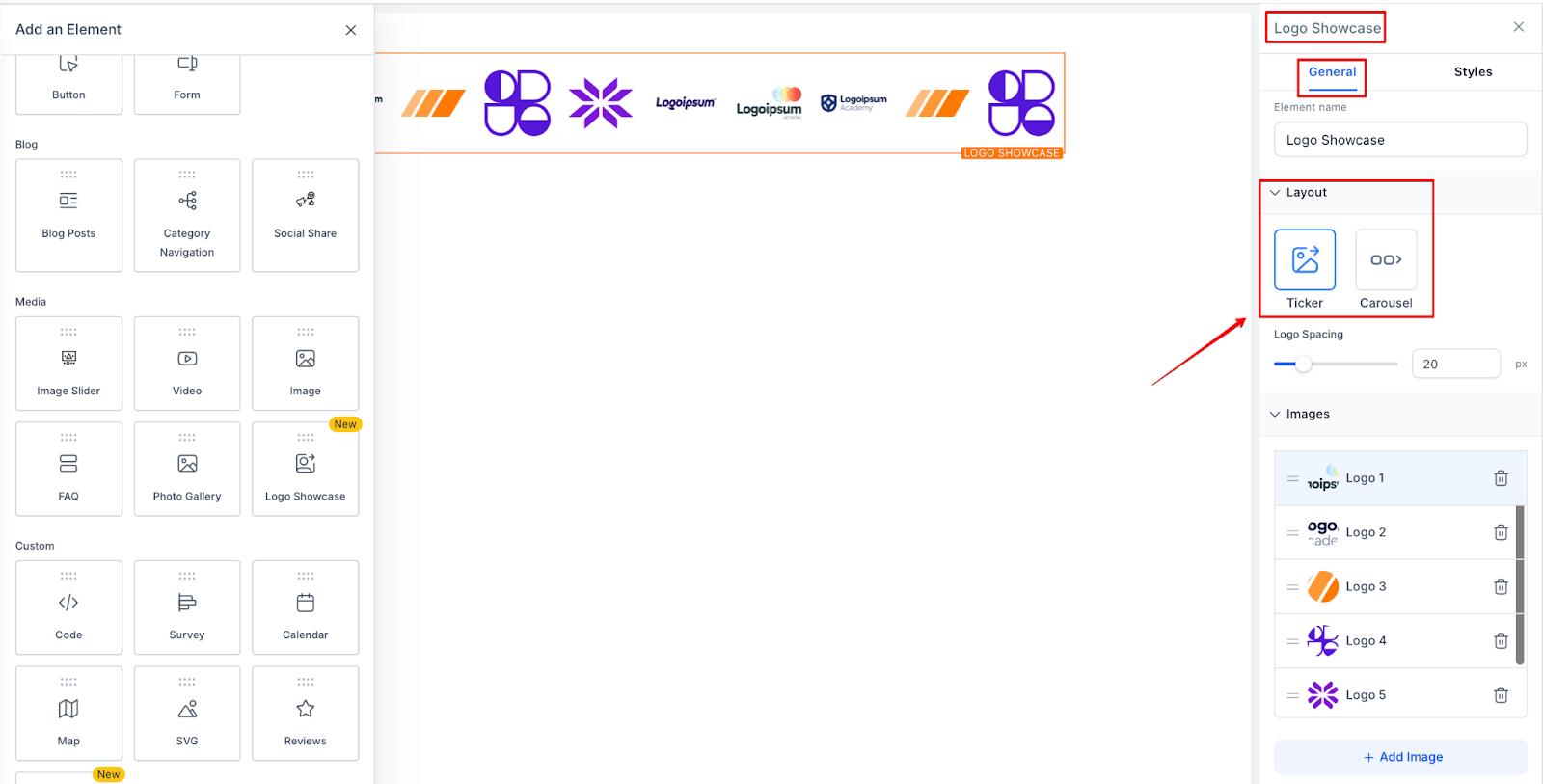 Section titled “Notes:”- The Logo Showcase Element is currently only available in the new sidebar experience. If you are still using the old sidebar, switch to the new one via Labs to access this feature.