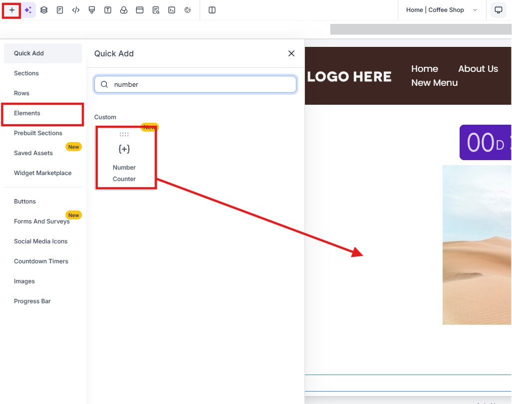 Section titled “How to Use It:”1. Add the Element: Navigate to Sites on the left > Funnels/Websites at the top and open the builder. Drag the Number Counter element onto your page from the element menu (+ icon).