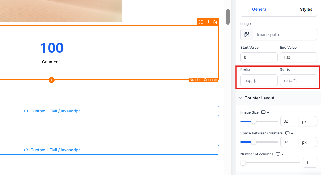 5. Customize Layout: Set the number of counters per row (1–5) and adjust the spacing between counters.