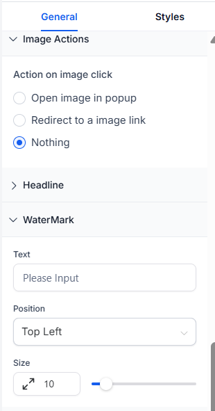 - Image Info & Actions: Add captions and descriptions to images. Choose click actions like opening in lightbox or redirecting to a URL. Use watermarks for added branding and protection.