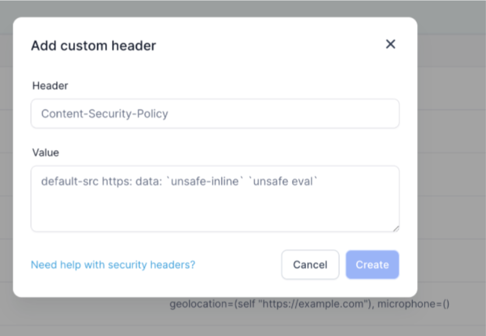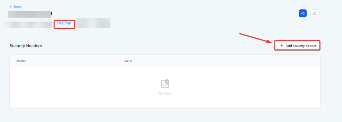 - Add Security Headers: Click on the option to add a new security header. This will open a modal where you can enter the header name and value.