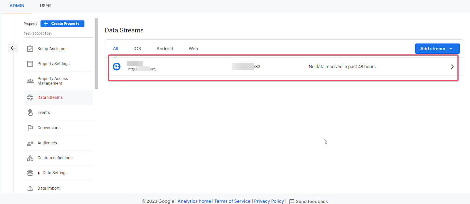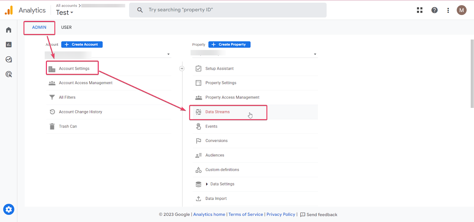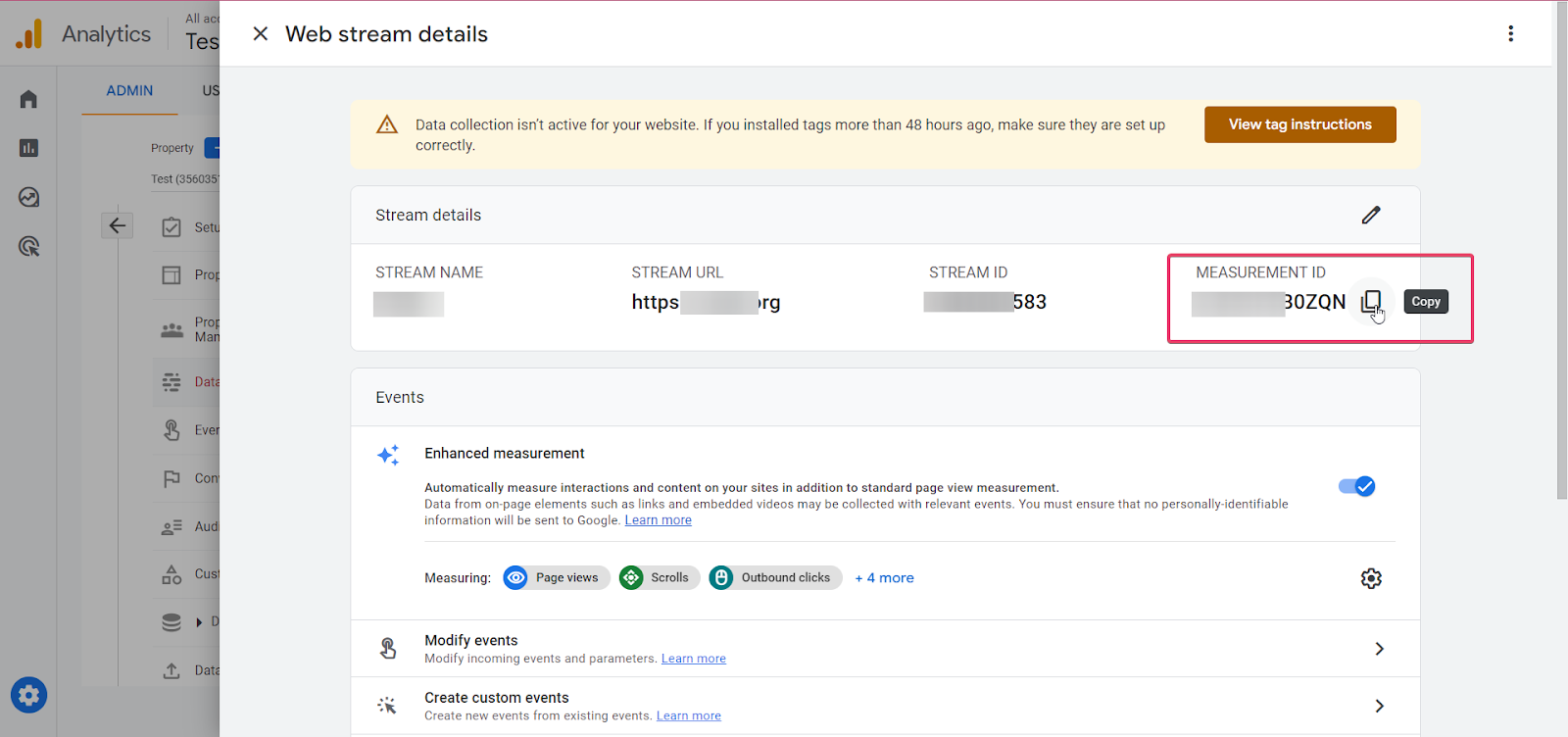 Section titled “Step 6: Enter Measurement ID”Retrieve the Measurement ID from your Google Analytics account. Access Google Analytics, go to Account Settings, then Data Streams. Select the appropriate data stream, and copy the Measurement ID.
