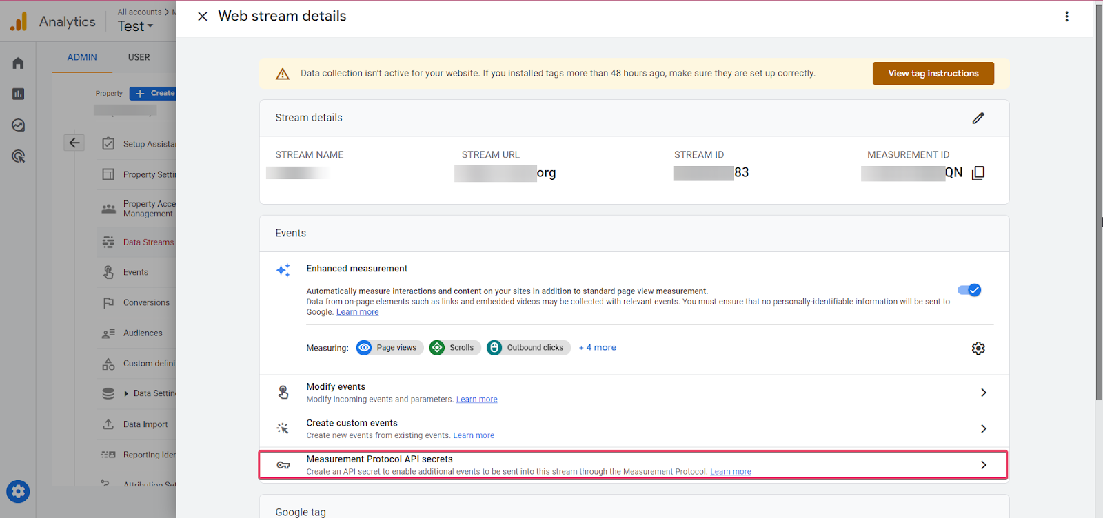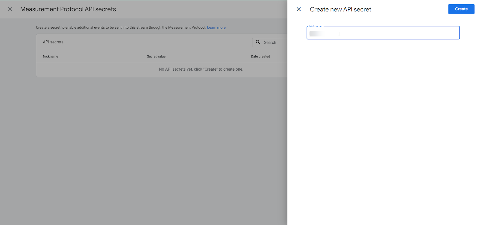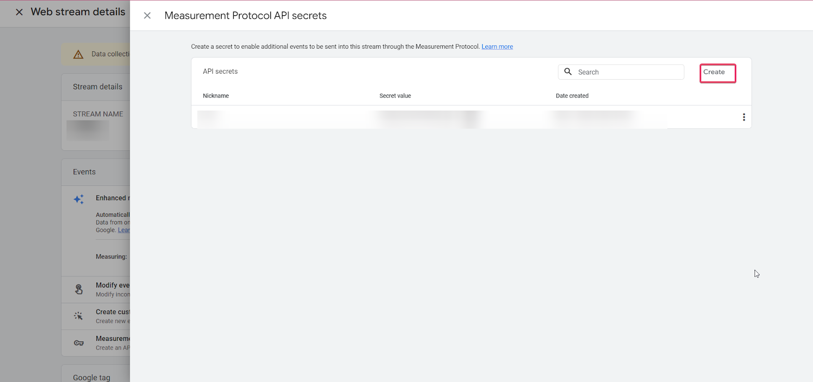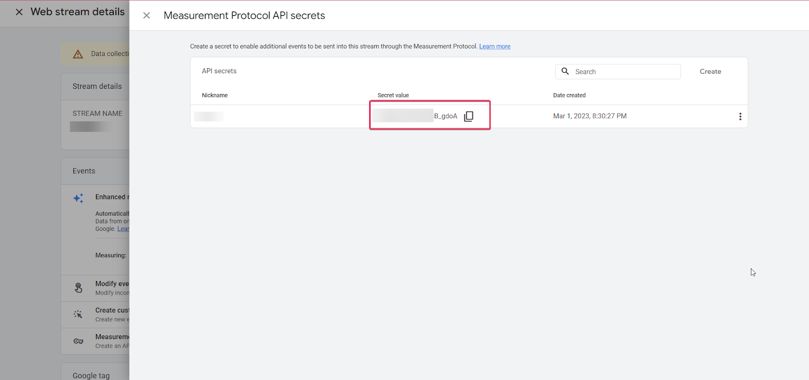 Section titled “Step 8: Obtain API Secret”In Google Analytics, navigate to Admin > Account Settings > Data Streams. Select the relevant data stream, then click on “Measurement Protocol API Secrets.” Create a new API secret key, give it a nickname, and copy the value.
