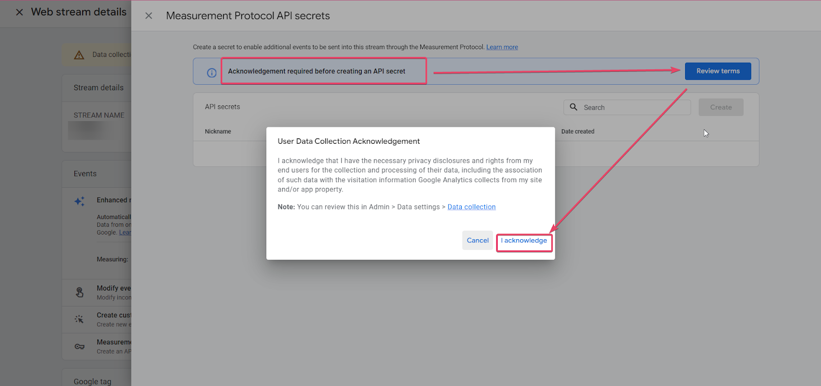 Before an API Secret can be created, you need to acknowledge that you have completed the necessary privacy discussions and have received the right from your end users for the collection and processing of data.