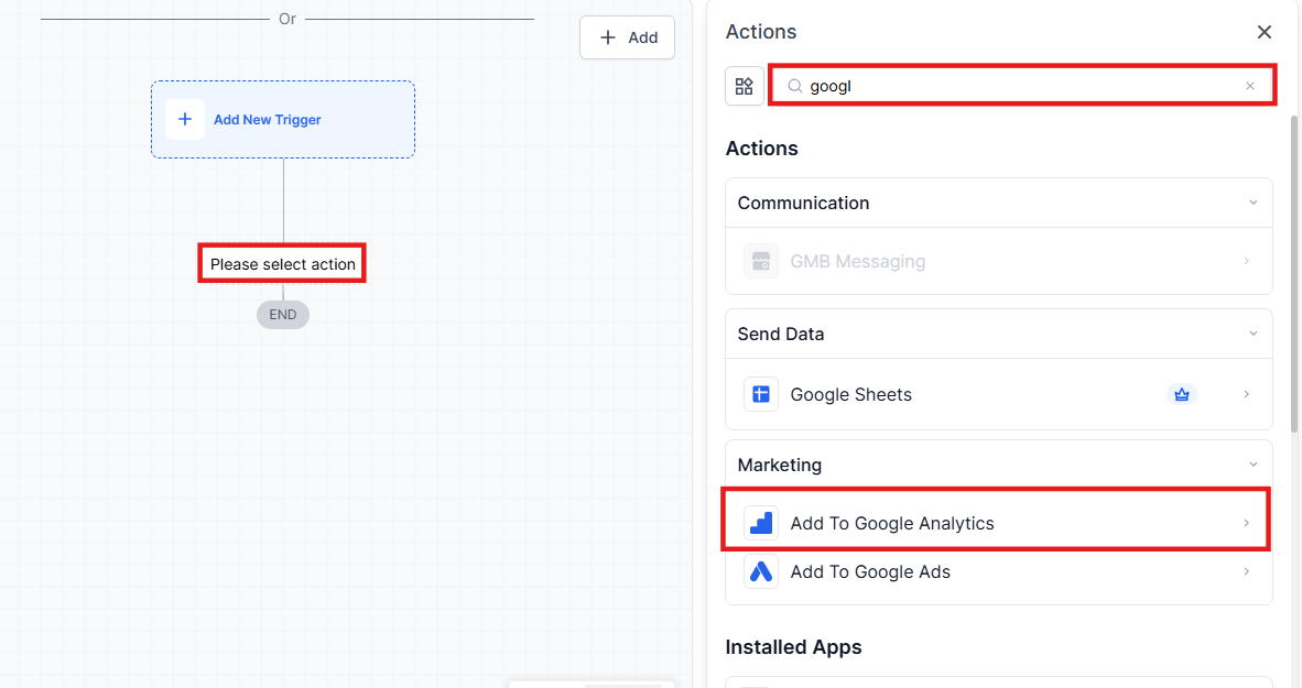 Section titled “Step 4: Add a Google Analytics Action”Within the selected workflow, locate the action section. Click on “Select Action” or the (+) icon to add a new action.
