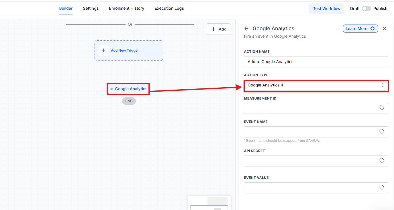 Section titled “Step 11: Save and Test”Once all configurations are complete, save the workflow. Test the integration by performing the specified actions within to ensure that data is correctly tracked and sent to Google Analytics.