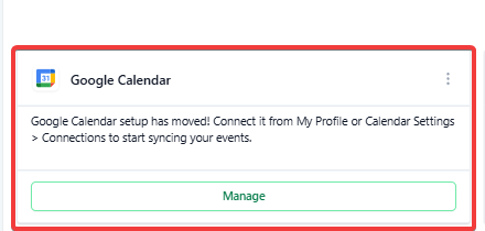 **Question:How do I connect my Google Calendar? Answer: To connect your Google Calendar, navigate to either “Settings > My Profile > Calendar Settings” or “Calendars > Calendar Settings > Connections Tab.” Once connected, Google Meet will be automatically enabled, and Google Meet links will be generated for your appointments, as long as a Google Calendar is linked.