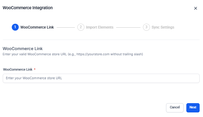 - Click the Connect button. A modal will prompt you to enter your WooCommerce store URL (ensure it follows the format https://yourstore.com without a trailing slash).
