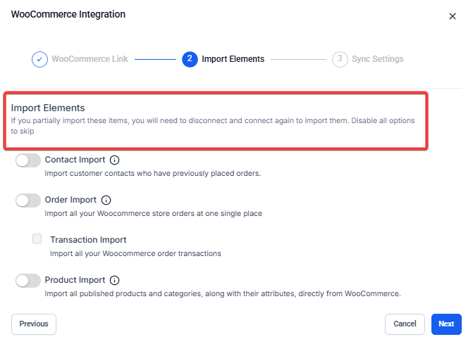- After connecting, you will be directed to the Import Elements screen, where you can select the data you want to import from your WooCommerce store. You can choose to import Contacts, Orders, Transactions, Products, and Collections.