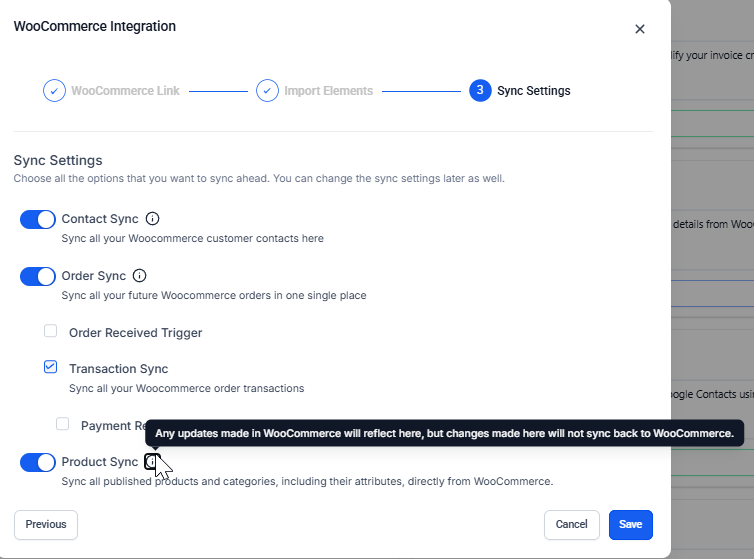 - To adjust sync settings later, simply return to the Settings screen to enable or disable specific elements for future orders.