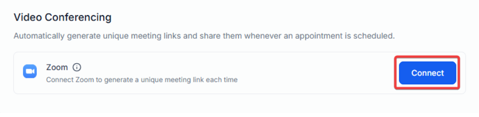 Section titled “Overview of Zoom Integration”Once integrated, Zoom meeting links are generated automatically whenever a new booking is made in your calendar. This integration streamlines your workflow by eliminating manual tasks and ensures that every invite includes a unique Zoom link ready to go for your next meeting.