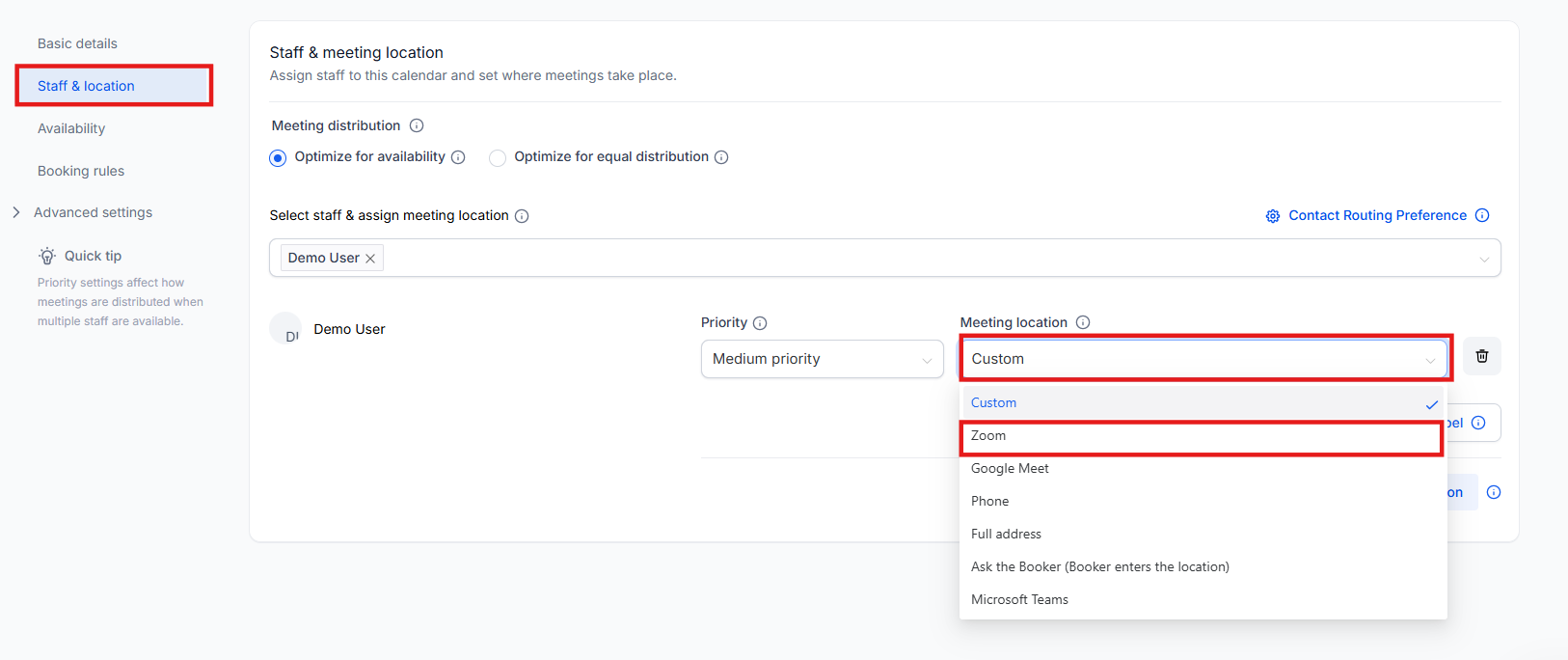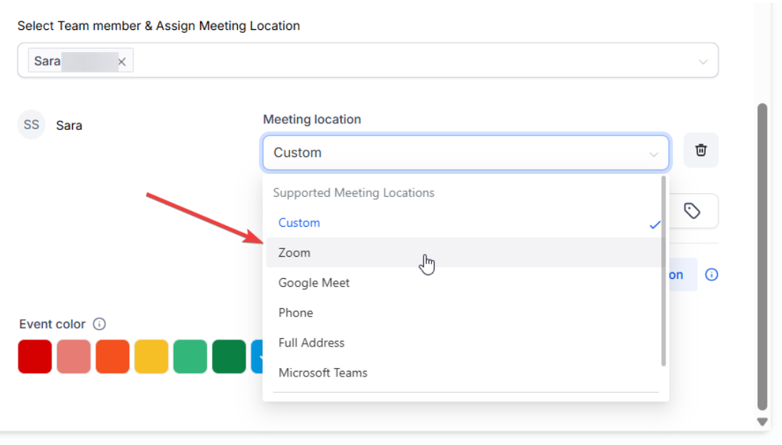 **4. Choose Zoom as the Meeting Location:**Under the Staff & location, find the “Meeting Location”, and select Zoom.