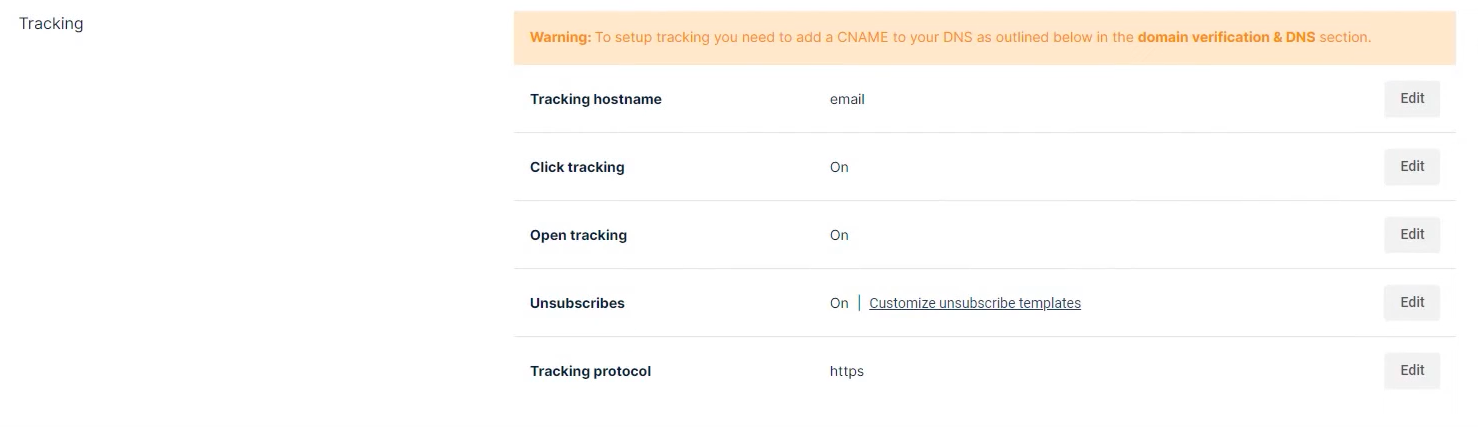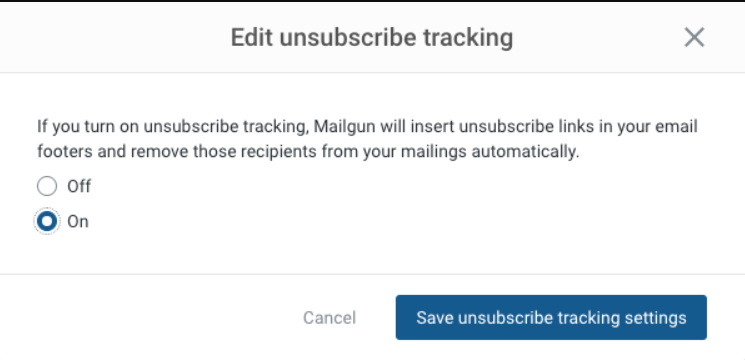 Section titled “Step 6: Set Up Unsubscribe and Tracking Options (Optional)”- In your Domain Settings on Mailgun, enable click and open tracking, as well as unsubscribe links, to maintain compliance and monitor your email campaign performance.