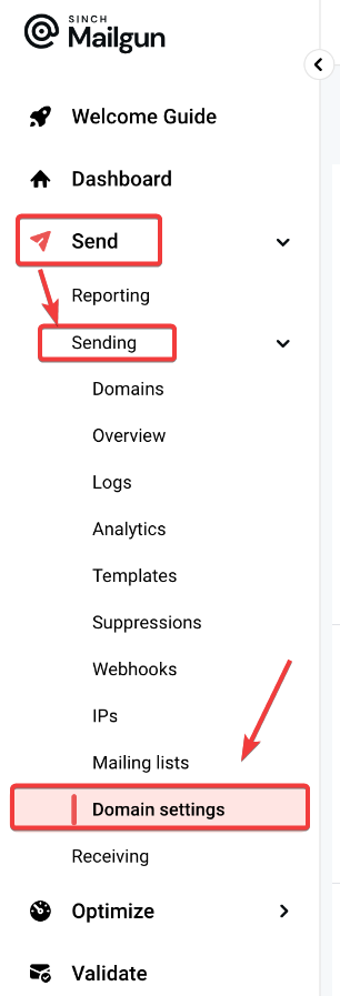 Section titled “Updating the Unsubscribe settings in your Mailgun account:”1- In the left-hand navigation panel, go to Send and click on Sending to expand the list of options. Then select Domain Settings.