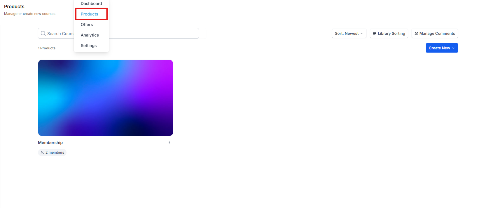 Section titled “1. Go to Memberships and hover over Courses”- Select Products