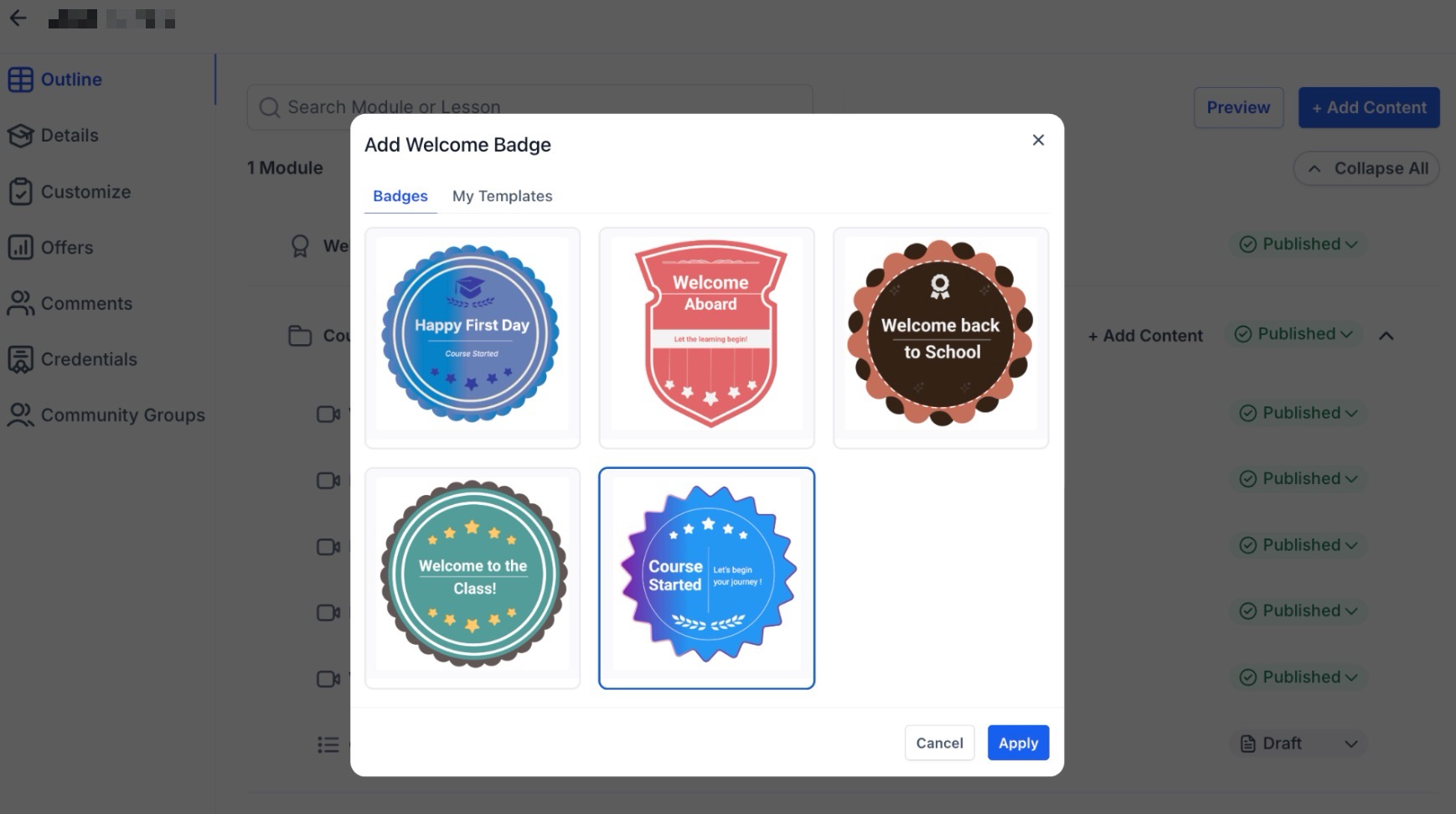 - Curated Templates: You can choose from five specific templates designed for course enrollments. To keep your workflow focused, only these five templates are visible in the Welcome Badge section.