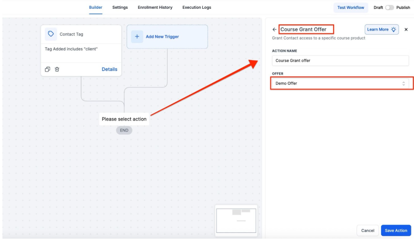 - Add the Course Grant Offer action to add the contact to the offer and include the product.
