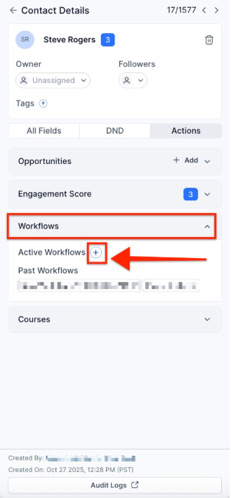 Please Note: You can also leave the trigger blank which will require you to use the manual option for adding a contact to a workflow. This is in the contact area (see screenshot below)