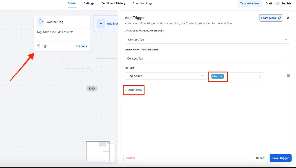 Section titled “Workflow 1:”- Add the trigger Contact Tag then filter for the added tag and save.