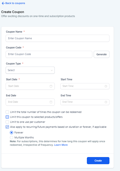 Question: How can I create a new coupon? Answer: Go to Payments > Coupons and click on “Create Coupon.” Label your coupon, assign it a code (e.g., SUMMER20), select either a percentage discount or a fixed amount off, and set the start date. You can also set an optional end date for limited-time promotions.