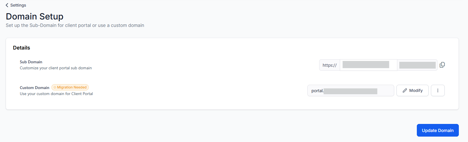 You can use a pre-configured subdomain under clientclub.net, which is already set up and ready for immediate use. Select this option if it suits your needs. Don’t forget to scroll down and hit Update Domain for the changes to take effect.