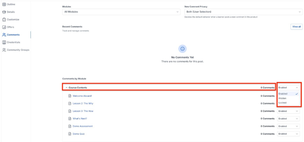 Select the specific lessons where you want to enable, hide, or lock comments.