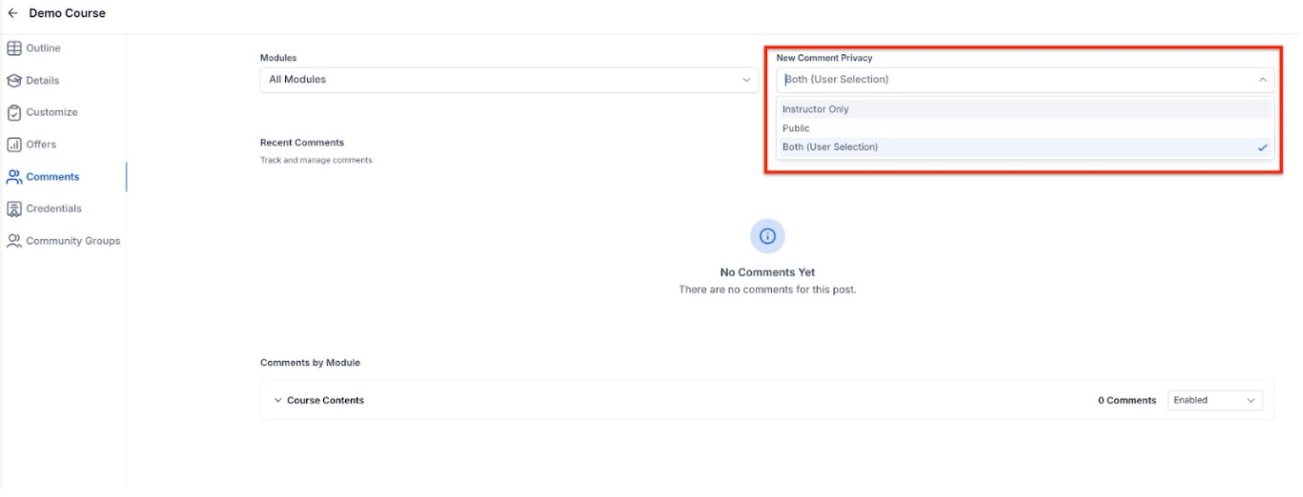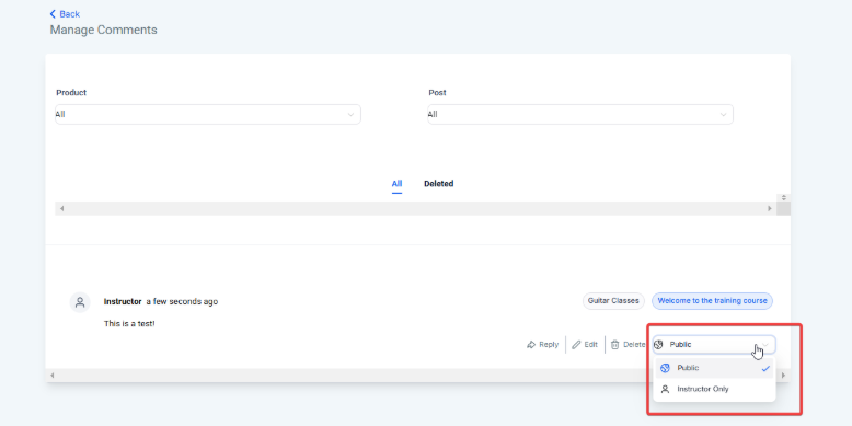 - Instructor Only: The comment will only be visible to the course creator and the student who posted the comment.