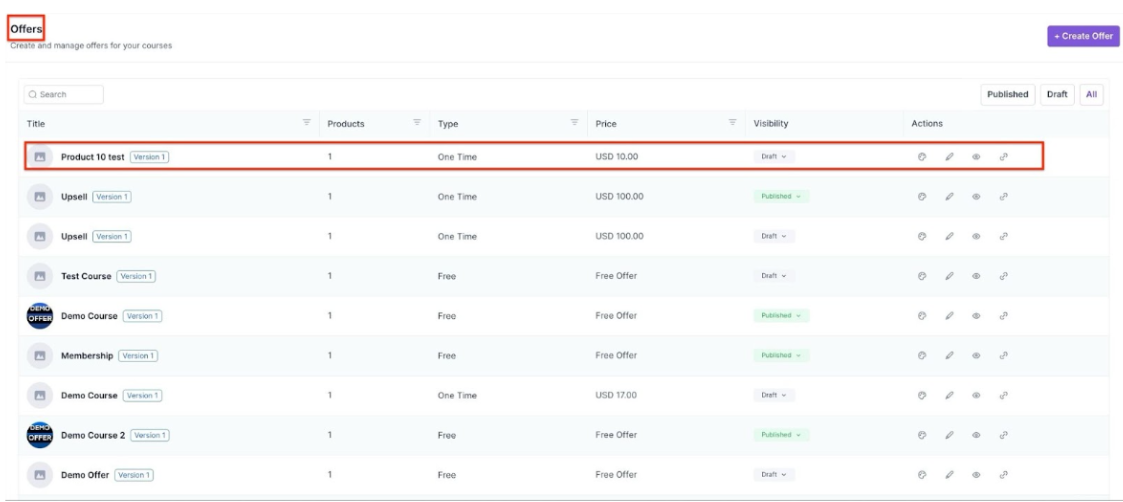 Note: Users can also create, view, and filter offers, all from within Offers sub tab within The Courses Products. All offers linked to the particular product will show in this tab.